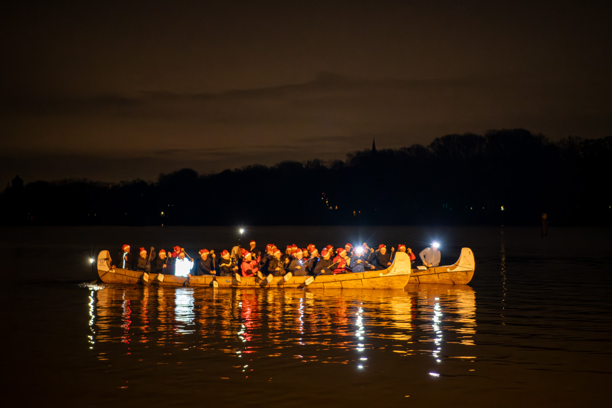 Die Beteiligung an dieser außergewöhnlichen Paddeltour war zwar bisher immer recht gut, doch noch nie so groß wie dieses Mal. 38 Sponsoren und Förderer meldeten sich an und wurden in zwei Zwanziger-Canadier aufgeteilt. Wetter, Wind und Temperaturen waren super und die Stimmung in der Dunkelheit auf dem Wasser wie im Hochsommer. Vielleicht spielte auch die Vorfreude mit auf den anschließenden Gänsebraten und die aufwärmenden Getränke in der "Kanuscheune". Peter Krafft hatte dabei wieder eine glückliche Hand und hat gemeinsam mit Beate etwas Leckeres gezaubert. Auch unser langjähriger Sponsor Frank Fahland überraschte wieder alle mit Weihnachtsgebäck und Canadier-Stollen. Dafür vielen Dank!