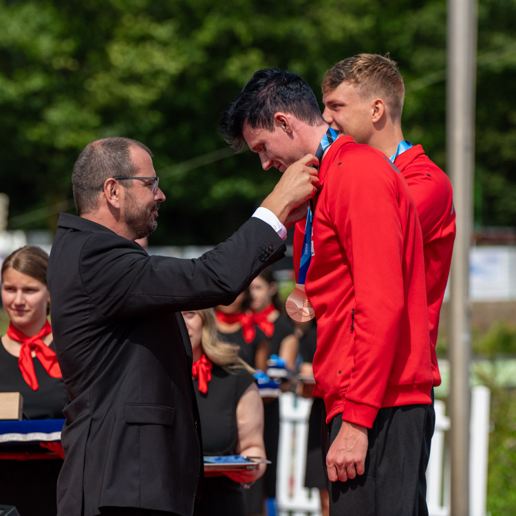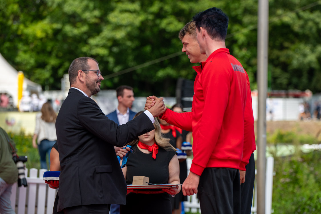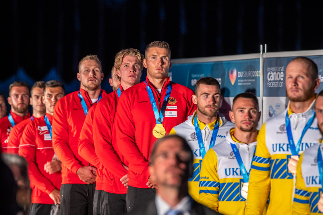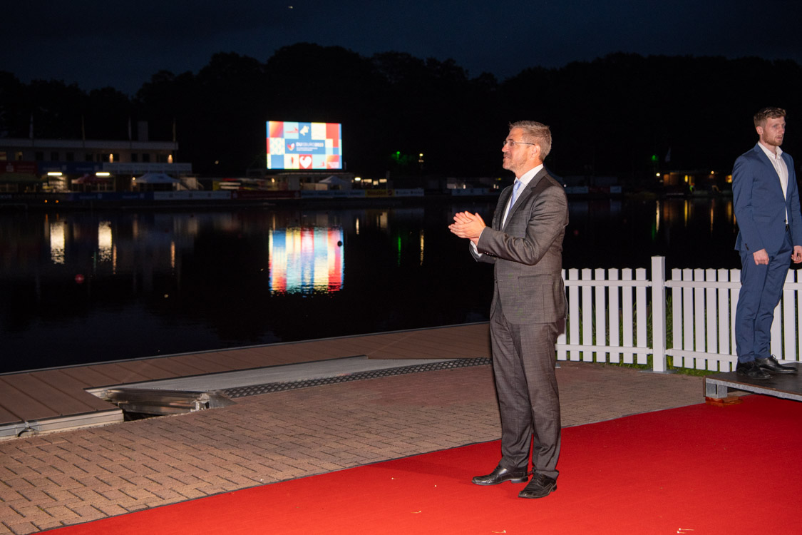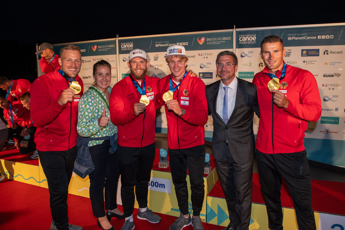 Max Lemke und Jacob Schopf siegten mit dem deutschen Viererkajak über 500 m und sicherten vier Quotenplätze für Paris 2024. In einem packenden Rennen, welches Aufgrund von Gewittern im Verlaufe des Freitags erst verspätet starten konnte, verwiesen sie die Besatzungen aus Ungarn und der Ukraine auf die Plätze zwei und drei. Nach einen schwierigen Saisonverlauf, bei den European Games Ende Juni in Krakau überquerte das Boot die Ziellinie lediglich als sechste, gibt dieses goldige Ergebnis Hoffnung auf die Olympischen Spiele 2024. Die Umsetzung im Boot, Tom Liebscher und Max Lemke tauschten die Position innerhalb des Bootes, haben sich dabei überaus positiv ausgewirkt. Dem Potsdamer Oberbürgermeister Mike Schubert wurde am Abend die Ehre zuteil, die Siegerehrung vorzunehmen.