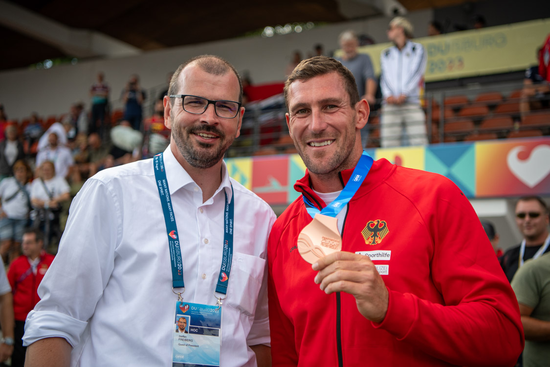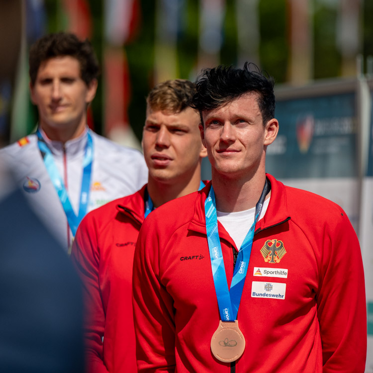 Hochzufrieden mit seinem WM-abschneiden war auch der dreimalige Olympiasieger Sebastian Brendel. Erst zu Beginn der unmittelbaren Wettkampfvorbereitung entschied der Trainerrat, dass der 35-jährige anstelle des Berliner Conrad Scheibener auf der olympischen 1000m-Strecke die deutschen Farben vertreten sollte. Nachdem Basti letztmalig im Jahr 2021 bei den Olympischen Spielen in Tokio international über diese Strecke an den Start ging, war dies auch für eine ungewohnte Situation. Sein Mut und der des Trainerrates wurden jedoch belohnt. In einem packenden Finale setze sich der gebürtige Schwedter dann gegen den Polen Wiktor Glaszunow durch und gewann hinter dem Tschechen Martin Fuksa und dem Rumänen Catalin Chirila verdient die Bronzemedaille. Für Basti, der mit Abstand der älteste Candierfahrer dieser WM war, war bereits die 60. Medaille bei internationalen Titelkämpfen. Die 61. Medaille folgte dann über die 5000m-Strecke, auf der er die Silbermedaille errang. Im Mixed-C2 über 500 m wurde Basti mit der Karlsruherin Sophie Koch fünfte.