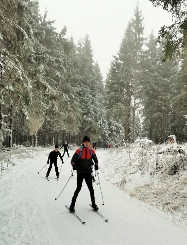 Noami Voigt: Den vierten Tag (05.01.) in Klingenthal begannen wir mit einem reichhaltigen Frühstück und teilten uns darauf in zwei Gruppen. Eine Gruppe ging mit Clara (Thieme) auf die Piste und und erkundete dort die Bedingungen für das Skilaufen. Die andere Gruppe absolvierte ein sehr anstrengendes Cross-Training. Der Neuschnee ermöglichte anschließend die Durchführung kleiner Staffelwettkämpfe. Vor der Mittagszeit veranstalteten wir noch eine Schneeballschlacht. Dem Mittagessen schloss sich noch eine kurze Verschnaufpause an und ann machten wir uns schon wieder auf den Weg in Richtung Skistadion, in dem wir einige Runden gelaufen sind. Den ersten Tag mit Skifahren beschlossen wir nach dem Abendessen mit „Hüftschwüngen nach Musik“, bevor wir erschöpft in die Betten fielen.