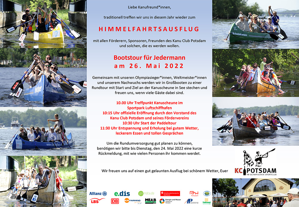 10:15 Uhr offizielle Eröffnung durch den Vorstand des Kanu Club Potsdam und seines Fördervereins 10:30 Uhr Start der Paddeltour