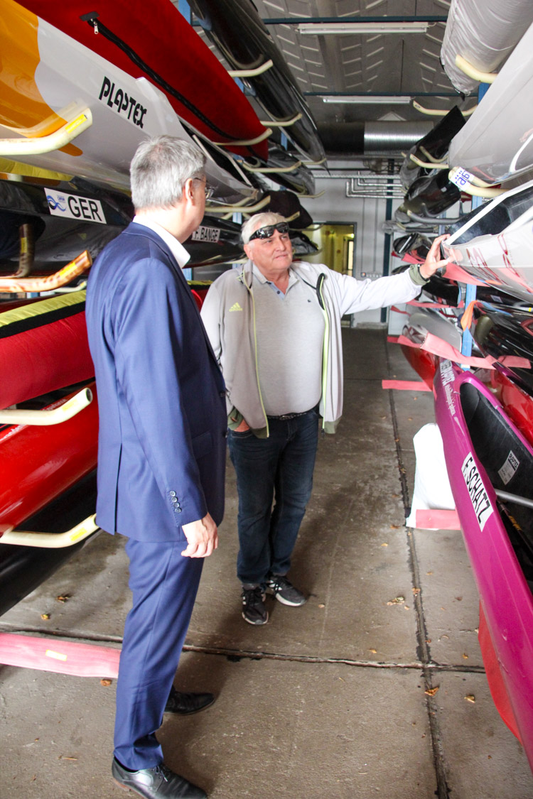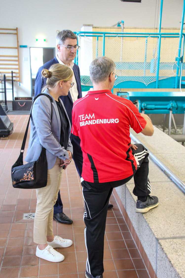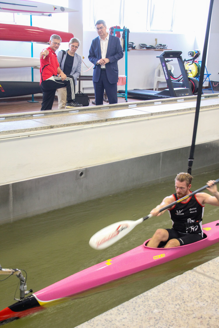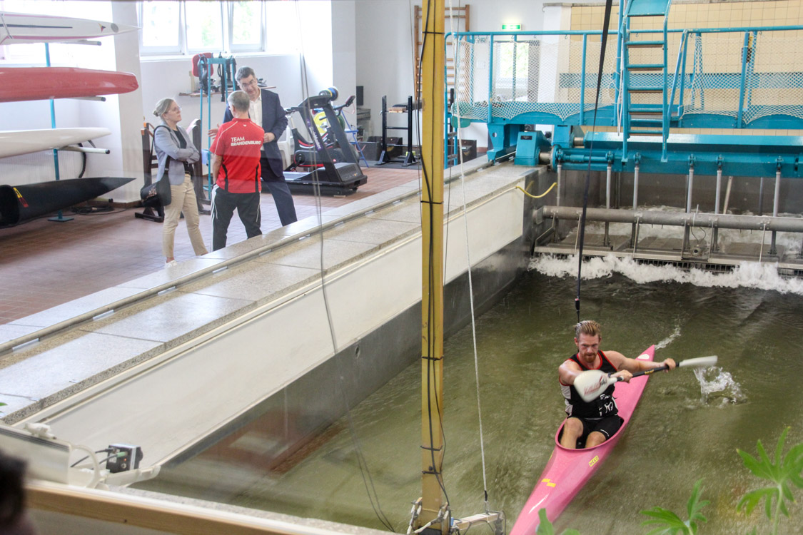 Um einen Einblick in den Trainingsalltag und das Geheimnis des Erfolgs sowohl der Potsdamer als auch der Deutschen Kanutinnen und Kanuten insgesamt zu bekommen, besichtigte Jens Riemer die Kanugegenstromanlage im Standort Potsdam des Olympiastützpunktes Brandenburg. In dieser seit 1983 genutzten, weltweit einmaligen Anlage können die Kanutinnen und Kanuten auch im Winter unter optimalen Bedingungen trainieren und in regelmäßigen Abständen Leistungstest durchführen, um ihren Trainingsfortschritt zu beurteilen.