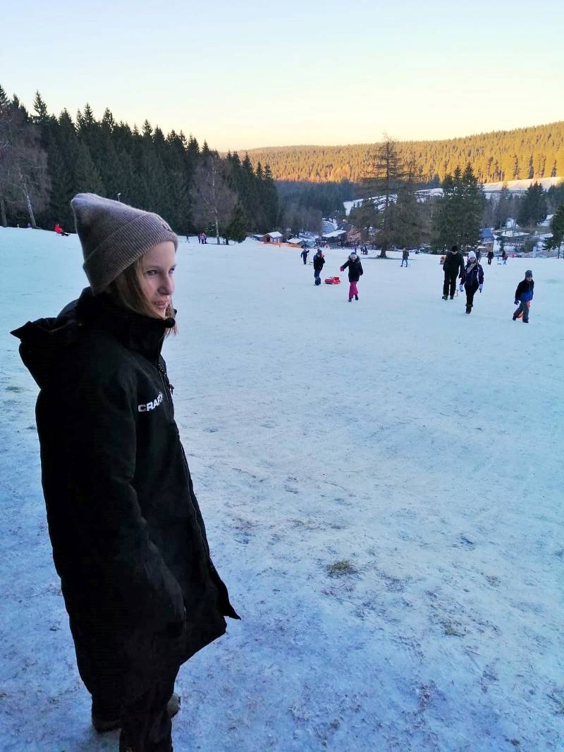 Noami Voigt: Den vierten Tag (05.01.) in Klingenthal begannen wir mit einem reichhaltigen Frühstück und teilten uns darauf in zwei Gruppen. Eine Gruppe ging mit Clara (Thieme) auf die Piste und und erkundete dort die Bedingungen für das Skilaufen. Die andere Gruppe absolvierte ein sehr anstrengendes Cross-Training. Der Neuschnee ermöglichte anschließend die Durchführung kleiner Staffelwettkämpfe. Vor der Mittagszeit veranstalteten wir noch eine Schneeballschlacht. Dem Mittagessen schloss sich noch eine kurze Verschnaufpause an und ann machten wir uns schon wieder auf den Weg in Richtung Skistadion, in dem wir einige Runden gelaufen sind. Den ersten Tag mit Skifahren beschlossen wir nach dem Abendessen mit „Hüftschwüngen nach Musik“, bevor wir erschöpft in die Betten fielen.