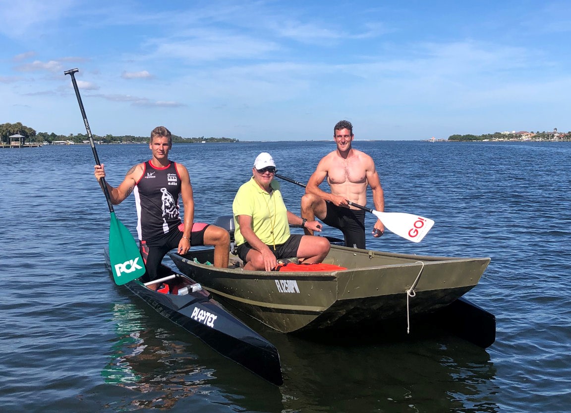 „Das vom Deutschen Kanu Verband organisierte Warmwassertrainingslager in Indian Harbour Beach/Florida vom 18.11.-11.12. hat perfekte Bedingungen geboten. Vom ersten Tag an hat sich die Sonne gezeigt und es auf angenehme 20 Grad gebracht, was perfekt für die langen Trainingseinheiten ist, die zu dieser Zeit der Vorbereitung gefordert werden. Die Canadierfahrer der Trainingsgruppe um Ralph Welke hat sich für den Klassischen 2 1/2 Tage-Rhythmus entschieden um möglichst viele Kilometer im Boot zurückzulegen. Nach 2 1/2 Tagen Training was ca. 10 Trainingseinheiten entspricht gibt es einen halben Tag Pause. Die Umfänge waren wieder extrem hoch, sodass wir in der Woche auf ca. 30 Trainingsstunden gekommen sind. Im Focus lag natürlich das Paddeltraining, aber auch im Fitnessstudio oder bei Strandläufen sind wir ordentlich ins Schwitzen gekommen und haben an unserer Kondition gearbeitet.