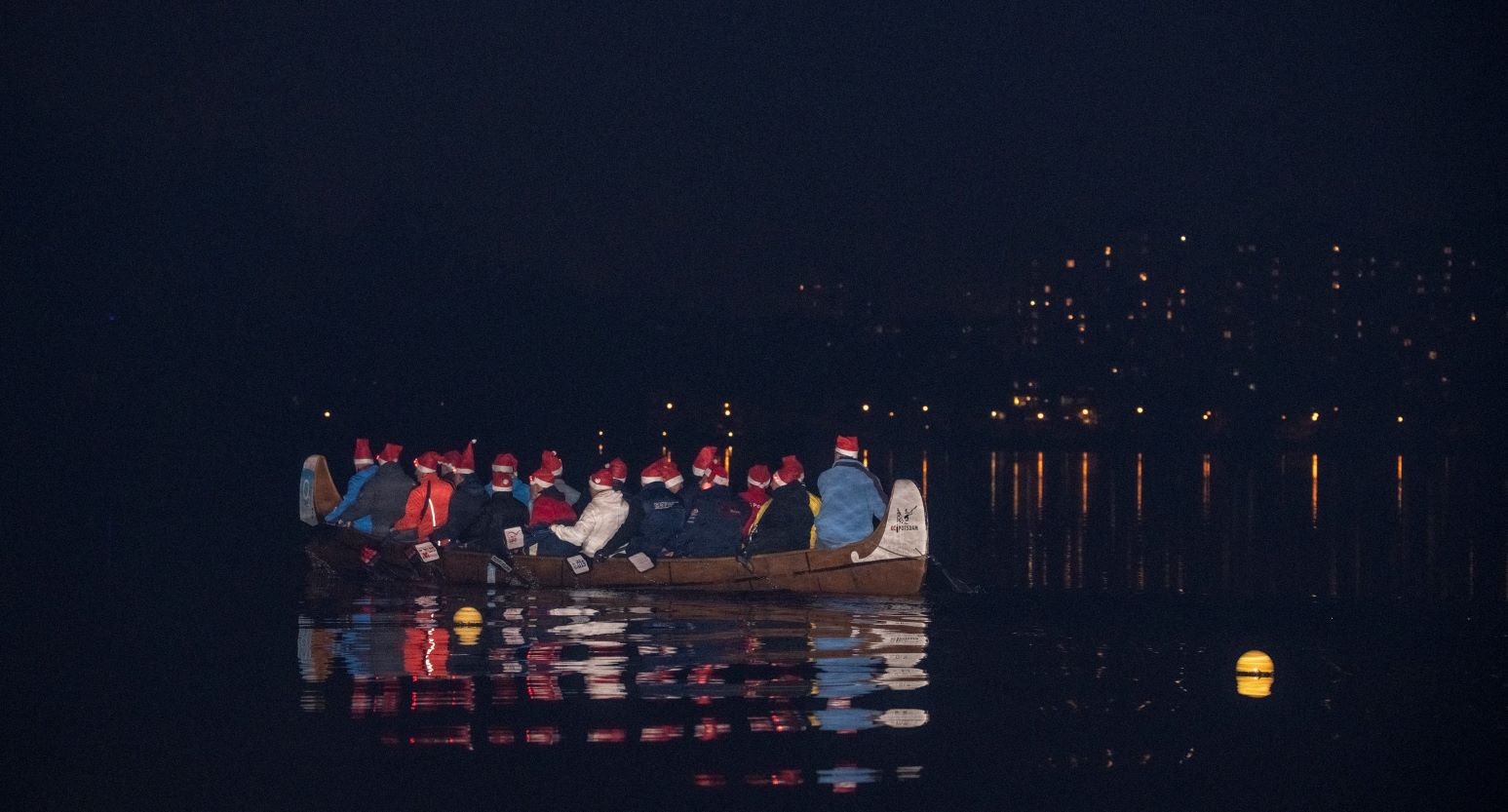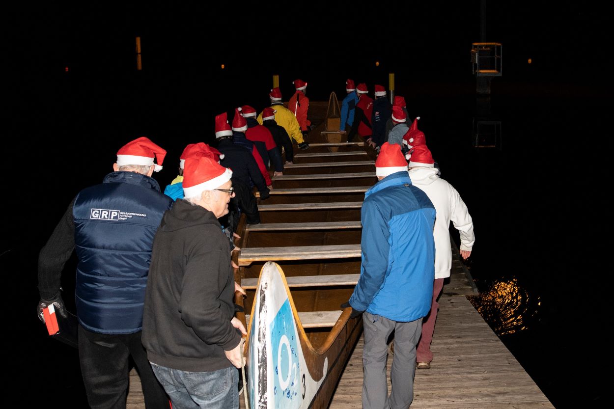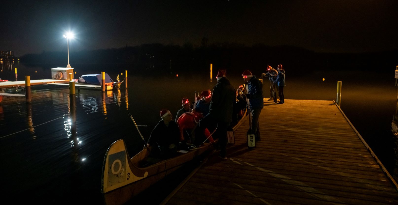 Gut gelaunt bei optimalem Kanuwetter, +5° Grad und Windstille und mit beleuchteter Nikolausmütze ausgestattet, war das Boot sehr schnell im Wasser und es ging zügig los. Die Flutlichtanlage war bald hinter uns und wir zogen unsere Kreise in der Dunkelheit. Doch bald merkten alle nachts reflektieren so viele Lichter auf dem Wasser, so dass man immer im Bilde ist, wo man sich befindet.