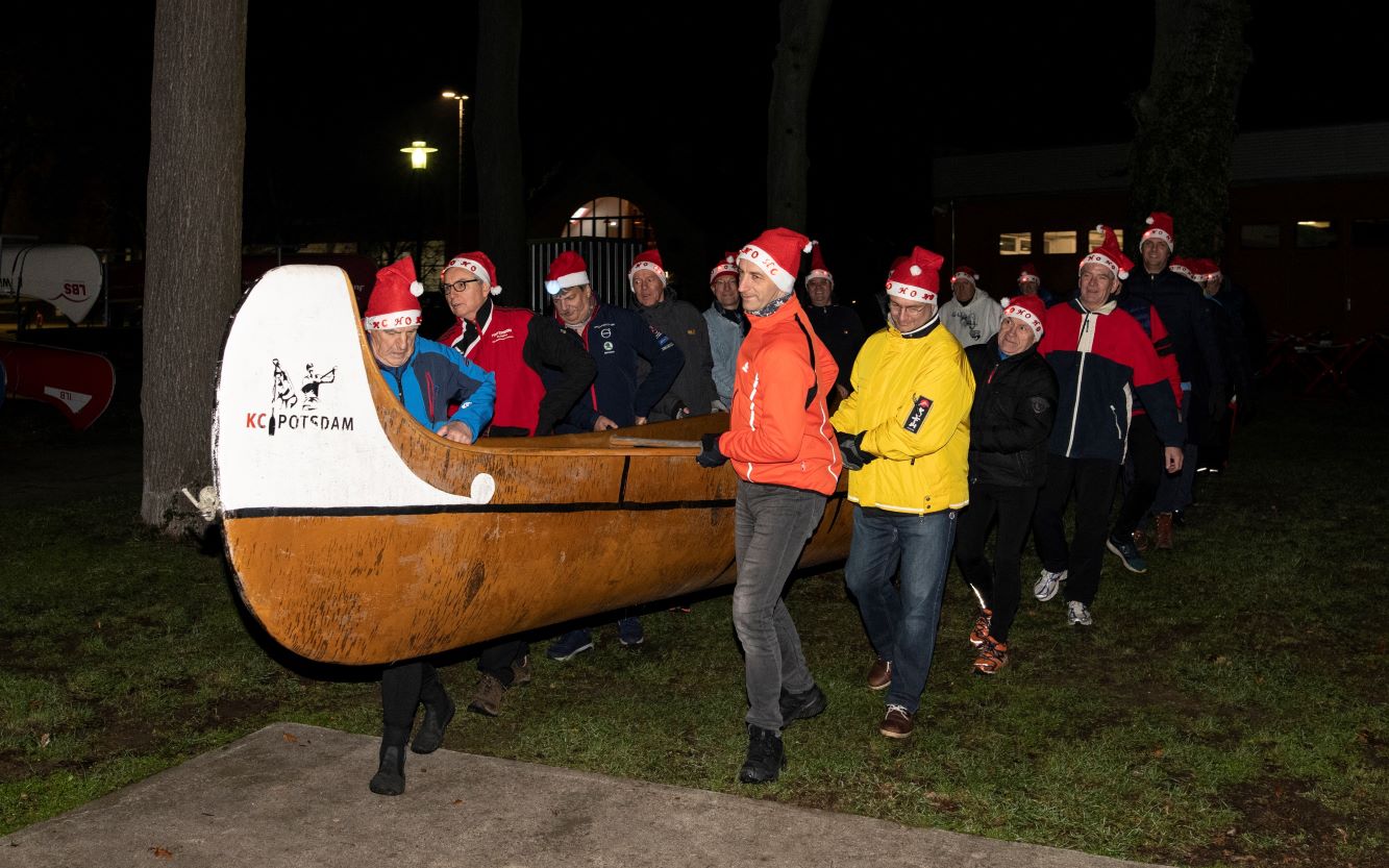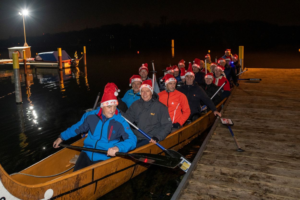 Nun schon zum dritten Mal fand am 4.Dezember das Nikolauspaddeln der Trainingsgruppe der Sponsoren unter Flutlicht im Zwanziger-Canadier statt. Nach anfänglichen Schwierigkeiten in den ersten 2 Jahren, Führungskräfte haben ja immer wichtigere Termine als etwas für ihre Gesundheit und Leistungsfähigkeit zu tun, hat sich in diesem Jahr eine große Stabilität in der Teilnahme des wöchentlichen Trainings entwickelt. Daher war es auch bei der Anmeldung eher so - ob wir denn auch alle in ein Boot bekommen - als dass wir Angst hatten, dass es nicht voll wird. Freudig begrüßt wurde auch ein neuer Mitpaddler in der Gruppe, unser ehemaliger Oberbürgermeister Jann Jakobs und seit vielen Jahren aktiver Paddelfreund des KCP.